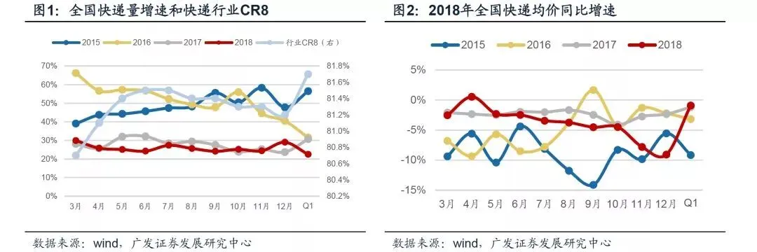 2018年,全国快递量同比增长26.6%,略低于2017年的28%。伴随行业增速趋稳,全国快递均价降幅较2017年有所扩大。行业竞争加剧的背景下,中小快递陆续退出,头部公司抢占中小快递份额的阶段即将结束,龙头快递间的竞争正逐步拉开。