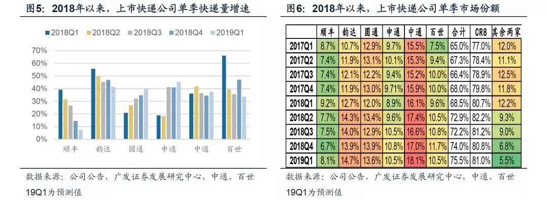 截止2019Q1, CR6 预计已突破76%,CR8 继续上提。随着中小快递陆续退出,头部公司抢占中小快递份额的阶段即将结束,龙头快递间的竞争正逐步拉开。