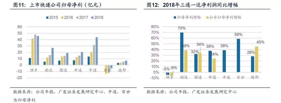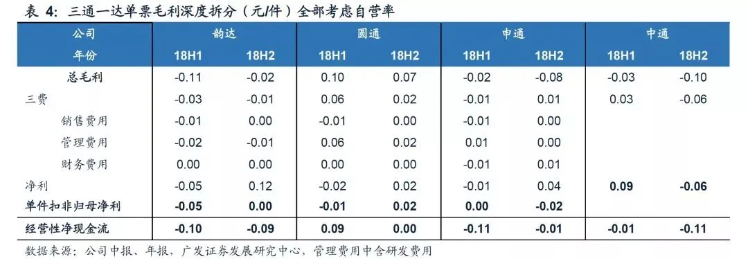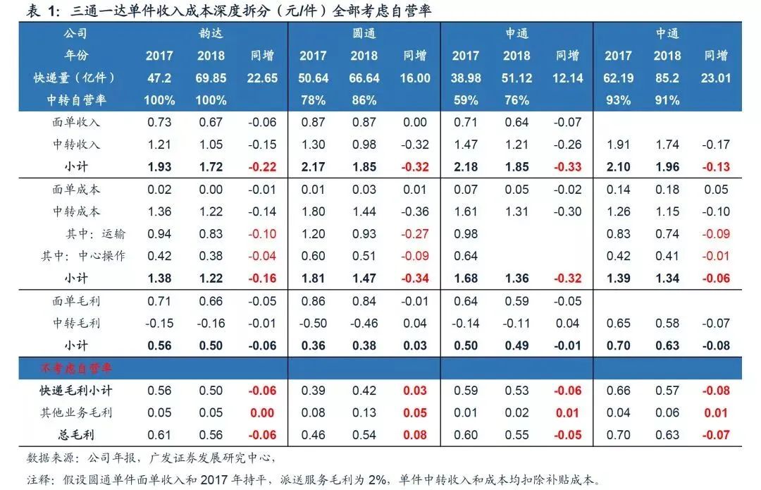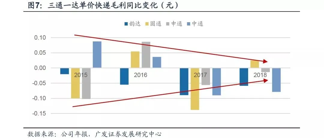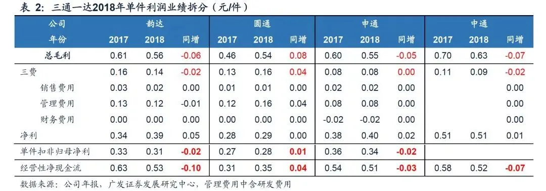 总体来看,三通一达2018年都不同程度地下调了快递费率,但下调幅度和成本端的优化幅度基本匹配。圆通、申通在成本下降幅度最大,费率下调也最大,快递量增速随之大幅回升,但下调费率并未对这两家的快递单件毛利产生较大负影响。