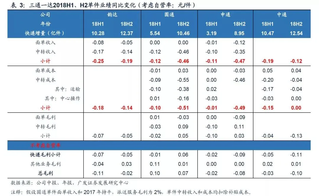 分18H1和18H2来看,圆通、申通下半年的快递单价分别同比下降0.46元、0.47元,降幅较18H1扩大;同时,圆通、申通下半年的单件成本也相应的加速优化,分别同比下降0.51元、0.49元;申通18H2的快递单件成本降低到1.25元,和韵达的距离大幅缩小;韵达18H2成本优化略有减速,中通18H2单件成本同比持平。