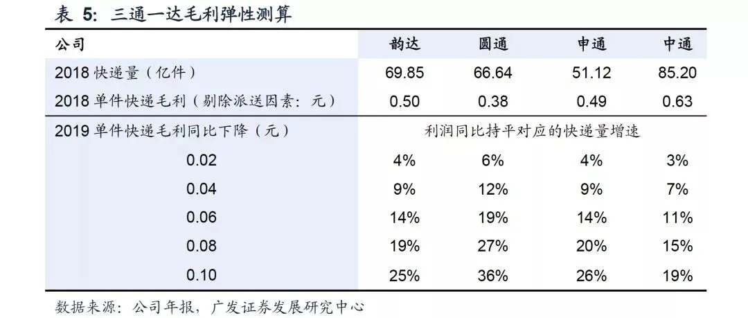 我们测算了2019年三通一达在不同的单件快递毛利降幅情况下,实现利润同比持平所对应的快递量增速,例如,圆通2019年单件快递毛利下降0.1元,那么快递量增速需要达到36%,才能实现快递毛利同比持平。
