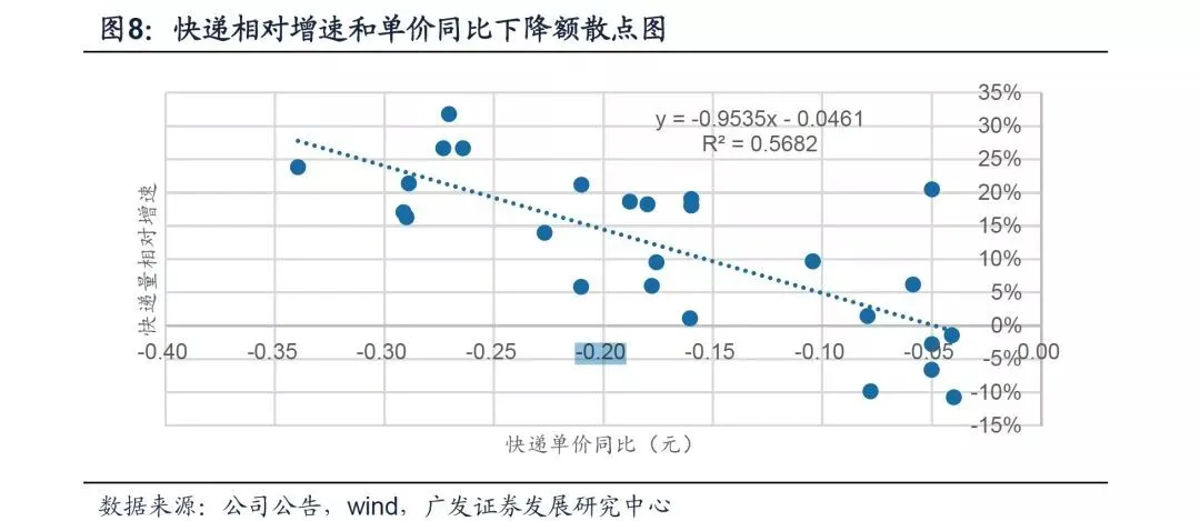 进一步的,我们用韵达、圆通、申通的月度经营数据作为样本,对快递相对增速(公司快递量增速减去行业增速)和单价同比下降额进行了线性回归分析,模型拟合显著。从拟合曲线来看,总部快递单价同比下降0.1元,快递量增速跑赢行业5pcts;假设2019年行业增速为23%,那么将对应28%的快递量增速。结合上述毛利分析,牺牲单件毛利对总利润的边际贡献太低,因此快递单件毛利将趋稳。