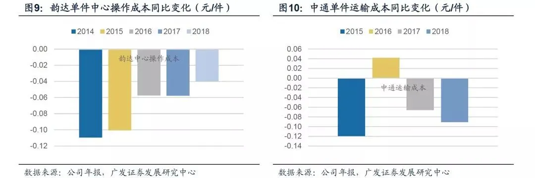 伴随竞争加剧,韵达、圆通、申通、中通 2018 年快递费率均有所下调,相应的快递单件成本分别同减0.16 元(-11.4%)、0.34 元(-20%)、0.32 元(-19.1%)、0.06 元(-4%);