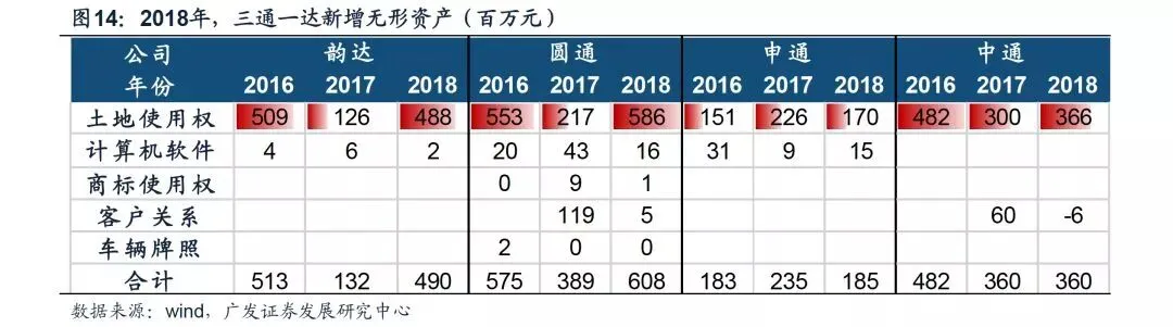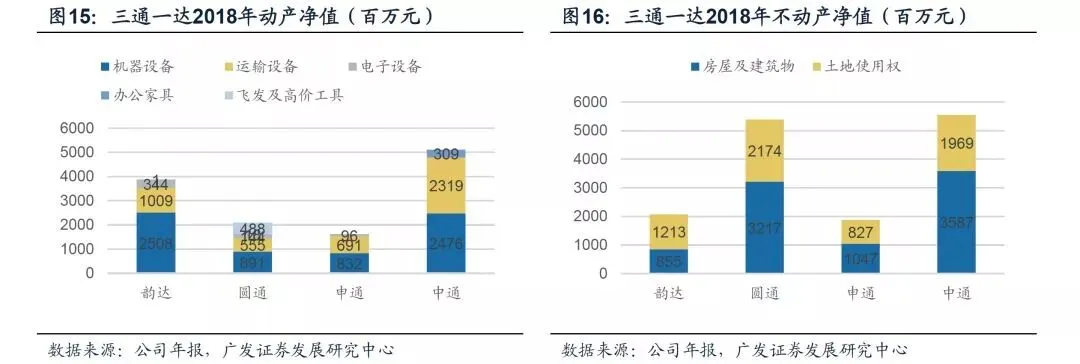 2018年,加盟快递净利润增速都在30%以上,经营性现金流大幅改善;此外,三通一达均加大产能投入,韵达、圆通、申通、中通固定资产净值分别同增约25.55亿元、29.54亿元、17.34亿元、33亿元,韵达的投资总额达到41亿元。