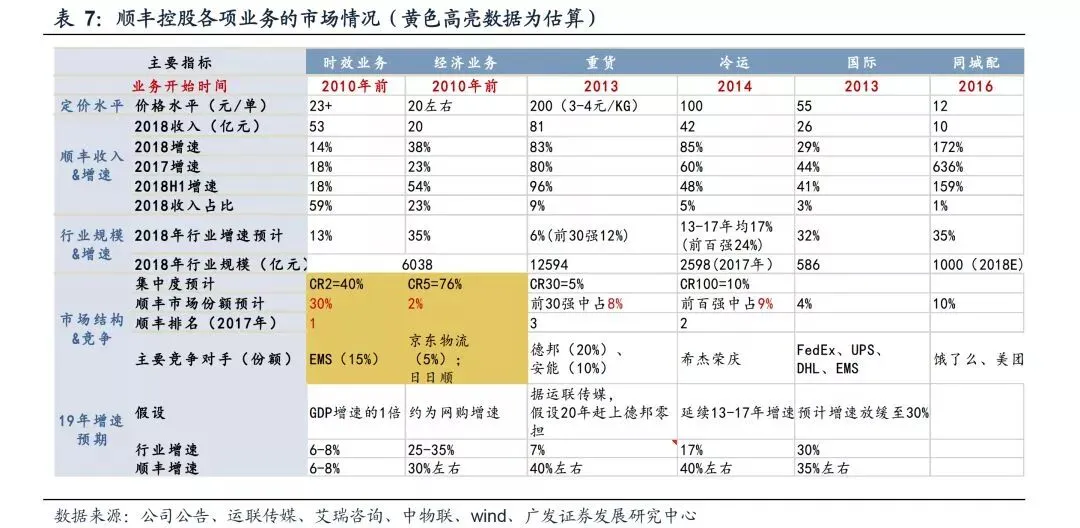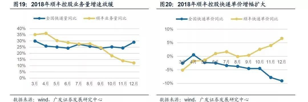 2018年,顺丰和德邦的新业务都在快速扩张。顺丰的重货、冷运、国际、同城业务收入分别同增83%、85%、29%、172%;德邦的快递业务收入同增65%,快递占营收的比超过了快运主业。两家直营快递都在经历主业增速放缓,新业加速扩张的过程,这对短期利润增长形成了一定压力。