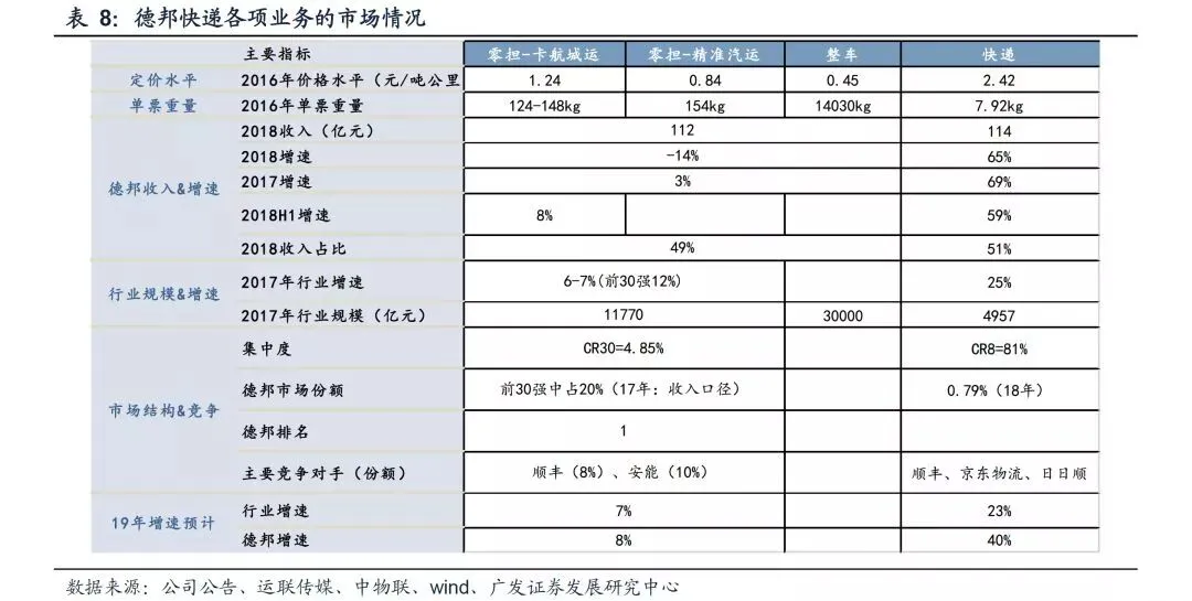 2018年,顺丰和德邦的新业务都在快速扩张。顺丰的重货、冷运、国际、同城业务收入分别同比增长83%、85%、29%、172%;德邦的快递业务收入同比增长65%,快递占营收的比超过了快运主业。
