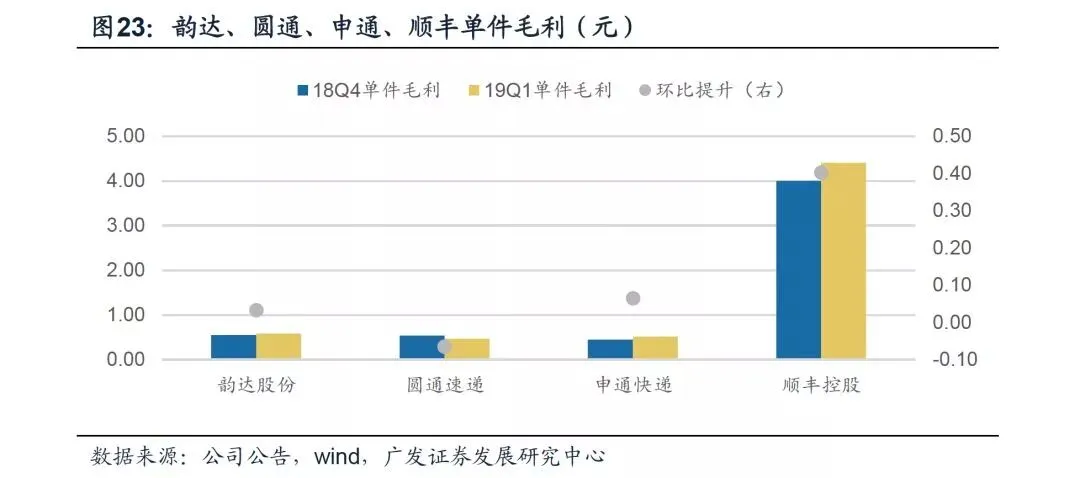 2019Q1,申通、韵达、顺丰单件毛利均环比18Q4显著提升,其中,韵达单件毛利为0.58元,较2018Q4提升0.03元(+5.9%);申通单件毛利0.52元,较18Q4环比提升0.06元(+14.34%);顺丰单票毛利4.4元,较18Q4环比增长0.4元(+10%)。