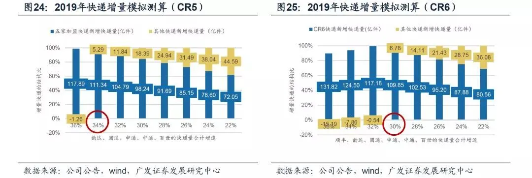 保守预计2019年将产生约117亿件的快递增量市场(同增23%)。CR5吃掉全部的增量的最低平均增速为高于行业增速约13个点,在此情况下,CR5将达71%。CR6将达77%。就市场空间看,行业增长仍能满足CR5平均36%左右增速,CR6平均30%以上的增速。