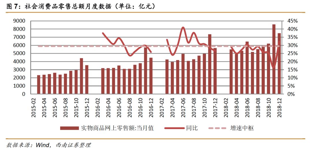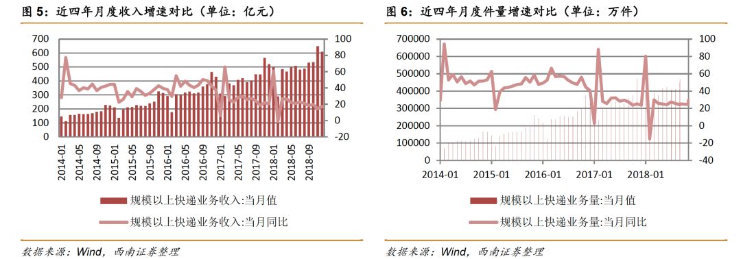 我们认为,快递行业收入与件量增速较之社会零售总额相比,呈现出了两个特点:一是,较强的韧性,增速下滑幅度明显小于社零;二是,绝对增速显著高于社零,即社会零售平台向电商继续靠拢。因此,我们判断2019年快递行业收入与件量增速仍将保持20%以上的中高速增长。