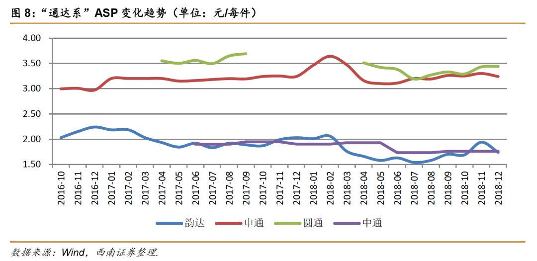 行业ASP持续下降,反映了各大快递公司之间的竞争愈发激烈。“通达系”ASP普遍在2018年下跌,其中韵达的单价下降最为明显,从2017年的1.95元下降至2018年的1.73元,降幅11.64%。我们认为,韵达的轻量化策略是导致其ASP下降的主要原因之一。
