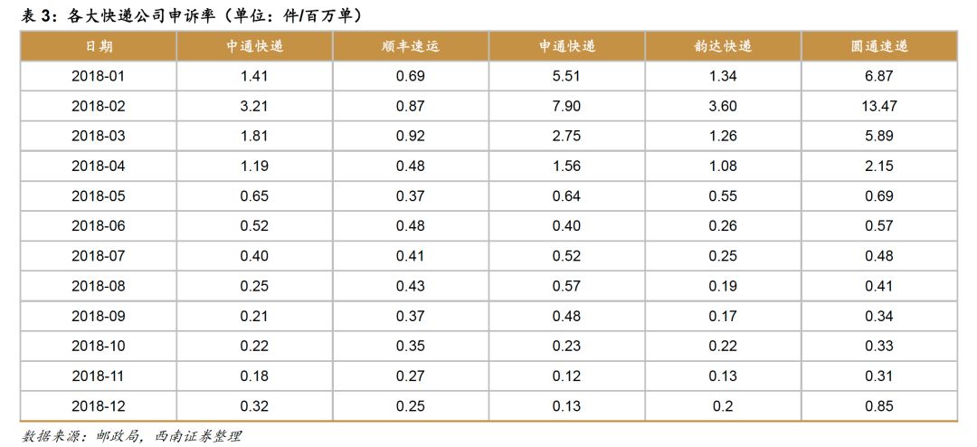 值得一提的是,在邮政局公布的12月有效申诉率排名中,韵达也好于其他竞争对手,每百万件的有效申诉率仅为0.2件,位列“通达系”+顺风五家中的第二。并且从历史数据中可以观察到,韵达的有效申诉率长期在0.5以下,在全行业中处于较低的区间。
