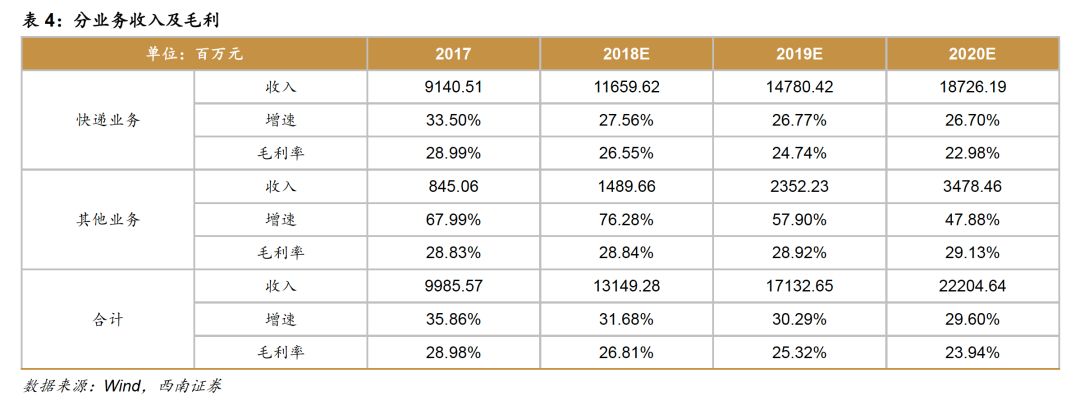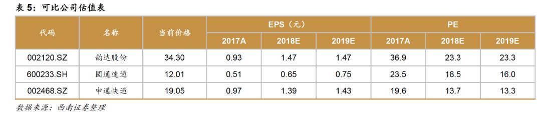 在快递行业增速放缓的今天,到手的市占率具有较高的含金量,较以往相对难以失去;另一方面韵达拥有“通达系”中最优秀的物流信息技术系统,不论是从单件人力成本还是路由优化上,强大的信息技术系统都起到了关键作用,因此我们认为,未来单件人力成本增速将下降。同时,韵达受益拼多多等小件电商件的逻辑不变,看好未来19和20年韵达的件量增速达到34%和28%。