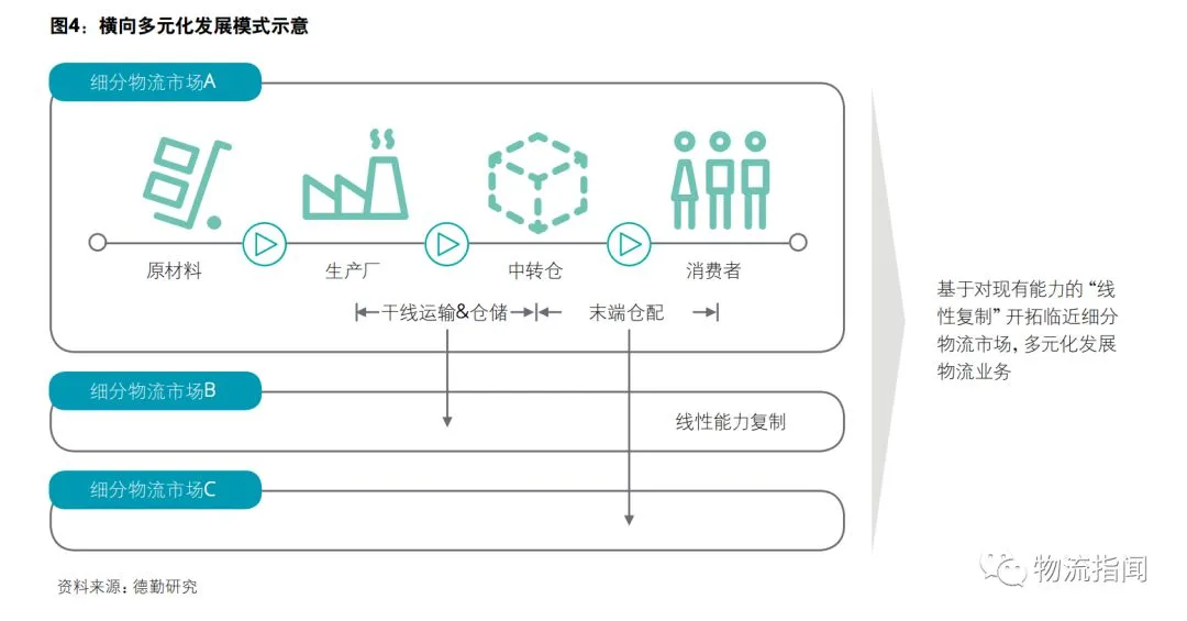 总而言之,对于基础物流服务商,横向扩张势必是当前发展和转型的优先选择之一。经过多年业务开展,它们累积了丰富的物流资源,如网点、线路等要素,以及品牌等无形资产。依托上述资源,这些企业得以将服务能力向临近细分市场“线性复制”,甚至实现业务的扩张。