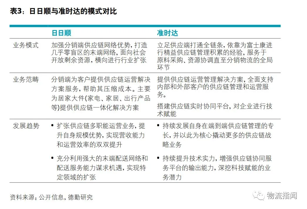 供应链管理是合同物流的更高层级,也是物流发展的终极阶段。物流企业与其客户的合作达到战略高度,服务内容也升级为供应链的整合与优化。此层级既有玩家大多脱胎于大型制造业企业的自建物流,天然具备较长的供应链链条管理与服务能力。如日日顺前身是海尔集团的企业物流部门,最早是在海尔企业内部搭建起的供应链网络;再如准时达背靠富士康,通过为其提供精益供应链管理服务积累了丰富经验。两家企业在脱离母体、对外扩张的过程中呈现出两种战略聚焦的选择:分销端与供应端。