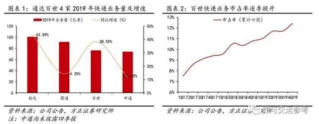 百世快递Q4业务量24.38亿件,同比增长30.5%。2019年累计业务量为75.76亿票,同比增长38.5%。2019年市占率由去年同期的10.8%提升至11.93%,继续保持行业第四。