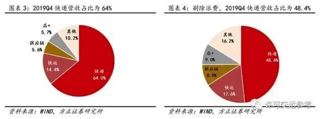 Q4快递业务单季度收入为68.96亿元(含派费),同比增长16%。由于公司只是经手派费,并不从派费中获利,剔除快递派费36.08亿元及快运派费3.62亿元影响之后,2019Q4快递业务(不含派费)占总收入(不含派费)比重为48.4%。