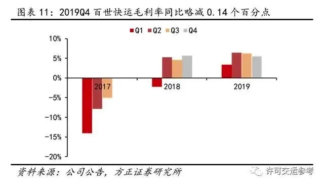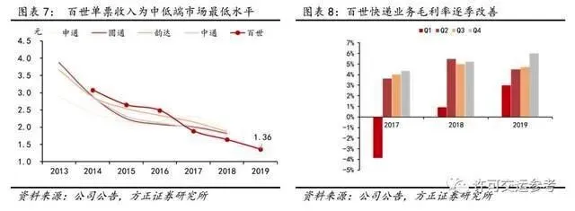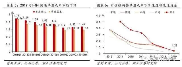 由于百世起步时间较晚,其快递服务品质的稳定性仍略滞后于通达系1-2年,同时受2019Q4中低端快递市场价格战加剧影响,百世快递单票收入由1.53元下滑至1.35元,同比下降11.76%,为通达系最低水平。单票毛利0.17元,毛利率6.01%,同比增加0.66个百分点。