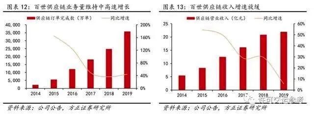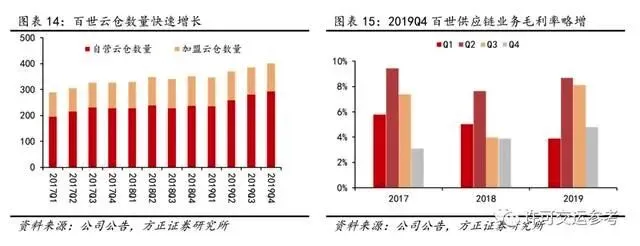 为提升盈利能力,百世店加业务2019年主动调整订单结构,加速培育品牌店订单,并砍掉部分低质量会员店订单。受此影响,Q4百世店加业务完成总订单量75.5万单,同比减少13.2%,店加业务收入6.11亿元,同比下降0.7%,但毛利率提升2.2个百分点至12.7%。