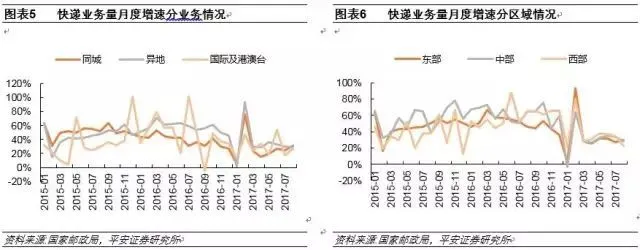 业务结构方面,异地业务为增速下降负主要责任,但亦是业务高增速维系主要支撑。对比16、17年前8月快递业务量累计增速,异地业务增速由60%降至31.9%,下降近30个百分点,叠加异地业务近70%的行业高占比,此次行业增速下降应归因异地业务。考虑异地、同城、国际及港澳台三类业务增速17年各月度表现,异地业务增速稳定30%,为当下行业增速主要支撑,2016年为同城业务爆发期,基于去年高基数,今年增速下滑较快,预计异地业务行业增速支撑现象将继续延续。