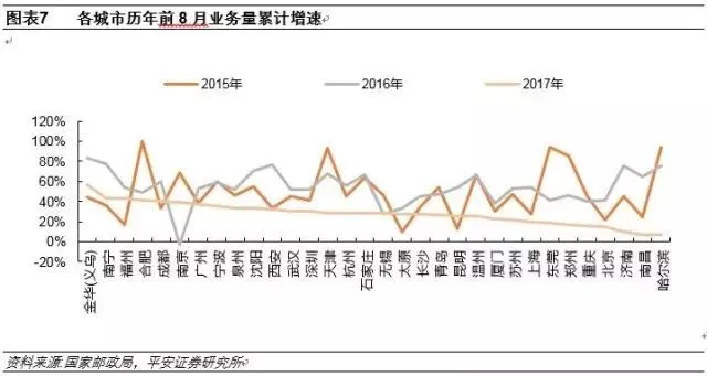 地区方面,各省市17年业务增速均有下滑,可见行业发展放缓为普遍现象,对比16、17年前8月业务量累计增速,中部地区增速下滑32.8%,东部地区下滑23.8%,中部地区问题相对严重,叠加占比因素考虑,东部地区业务占比超80%,由此,我们认为行业增速放缓东部地区也难辞其咎,实际上,参考一线城市增速排位情况,广州、深圳、上海、北京等大型城市已然步入成熟区,也为东部地区增速下降原因。