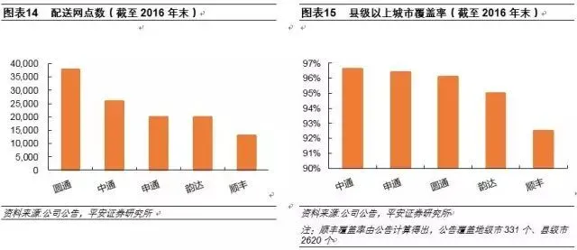 由于加盟模式下,收、派件端由加盟商负责,总部与加盟商合作,统筹快递收取、派发事务,故而,相较于直营模式各网点亲自筹建管理,加盟制企业的网点扩张更为灵活、速度更快。三通一达成立时间晚于顺丰,但凭借模式优势,至2016年末,圆通网点数37713家,中通紧随其后26000家,两倍于顺丰13000家,申通、韵达网点数略少但也均超20000家。县级以上城市覆盖率方面来看,三通一达覆盖率相当为96%左右,顺丰稍次,且响应政策号召,快递企业“向西向下”,目前申通在乡镇、团场各类四级区域的覆盖率已过半。
