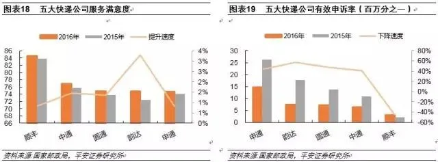 从国家邮政局公布数据可以看出,顺丰在全程时限等6项时限准时率指标测试中连续4年蝉联第一,同时,消费者对顺丰的服务满意度一直大幅优于三通一达,且顺丰具有更低的有效申诉率,扎实的网络基础建设孕育高服务水平。三通一达服务水平相当,但韵达的满意度提升和申诉率下降速度较快,推测与韵达注重直营建设、统筹规范有关。