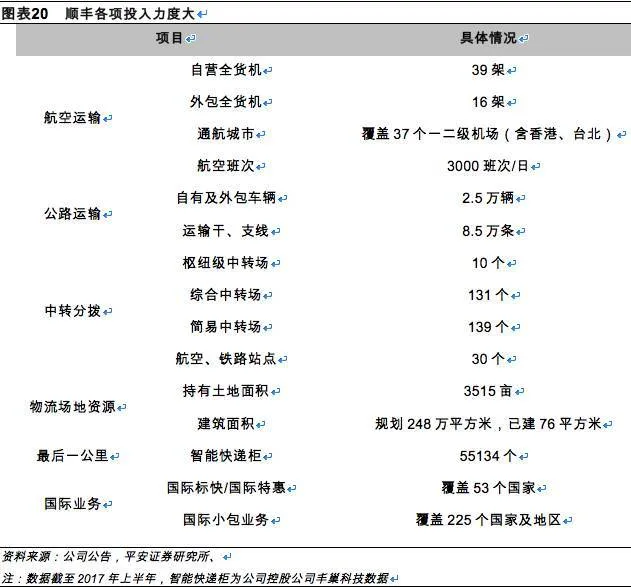 宏观而言,直营企业固定资产构成比例更重,微观层面则反映为更具规模的运输、中转体系建设和业务范围开拓,我们认为,全网统筹规划建设利于服务质量的提高。作为直营模式的代表,顺丰体现出明显的“天网+地网+信息网”优势,截至2017上半年,顺丰拥有自营货机39架,覆盖含香港、台北等一二级机场共37个(目前三通一达中仅有圆通对航空领域稍作布局),陆路运输布局全面,同时,“最后一公里”配送布局相对完善,涉足冷链业务,国际业务覆盖国家超200个,基于此推出相对多样化的时效配送和国际配送产品。