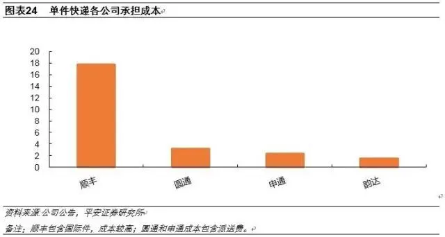 具体来看,公司总部一般为收件加盟商提供快递面单,故存在面单收入,同时,上游加盟商需向总部支付干线运输费用,故存在中转费收入,除此之外,总部一般还代收下游派送加盟商的派送费,对应到成本,公司总部会存在面单制作成本,与干线运输相关的运输、中心操作、办公租赁等成本,纸质面单制作成本不高,且现在大规模推出电子面单,面单成本基本可忽略不计。