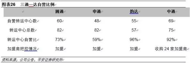 据公告数据,韵达、中通、圆通、申通转运中心自营比例分别为96%、92%、73%、59%,由此可见韵达对运输干线的把控能力较强。运转中心总数上,圆通、申通、中通数量相当,韵达之前整合效率较低的中心因而数量更为精简,对于加盟商的管理上,中通2014、2015年通过现金及股权方式累计收购24家加盟商,故总体而言,韵达、中通对全网的把控能力均处前列。申通一直采取大加盟商策略,从转运中心自营比例上可见一斑。