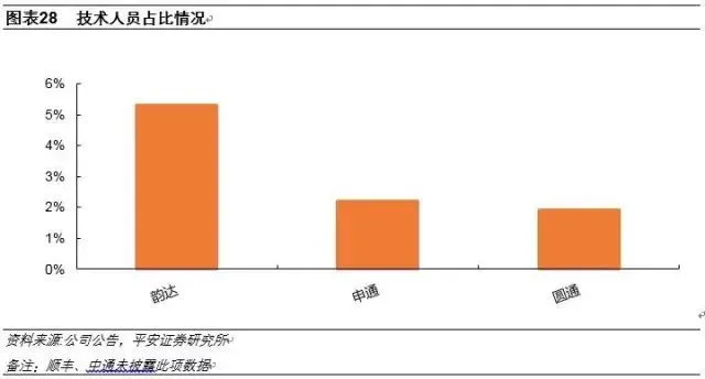据了解,三通一达转运中心自动化程度依次为:韵达圆通中通申通。快递公司均看重网络信息化建设,顺丰率先涉足信息化,业内水平最高,且未来也将持续投入,而就加盟模式来看,韵达、申通、圆通的技术人员占比分别为5.3%、2.2%、1.9%,表明韵达对信息化建设的投入亦较大,叠加目前领先的自动化水平,韵达信息化建设整体领先。