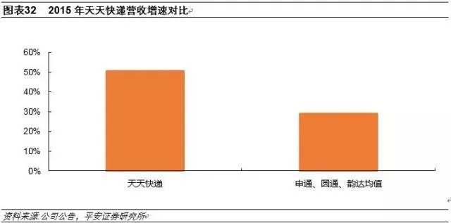 天天快递2010年5月成立,专注物流配送、快件收派, 2016年全年完成票件量12.6亿件,2014-2016年票件复合增长率57.3%。天天快递自营、加盟模式并举,快递网络覆盖全国绝大部分区域,配送业务相关资源投入与设施建设行业靠前,目前已在大部分省内提供次日达、部分省际跨区提供隔日达服务,在全国节点城市建立电商仓、专业仓,力求仓配一体,同时已涉足跨境业务。从营收增速来看,天天快递2015年营收增速显著高于申通、圆通、韵达均值,发展迅速,已跻身仅次顺丰、三通一达的第二梯队。