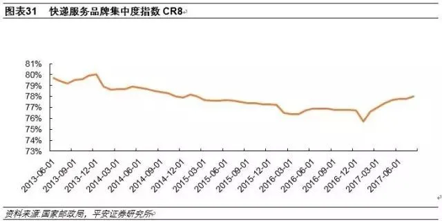 基于上述行业本源把握,集中度提升乃必然路径,目前行业发展即正处此发展通道中:2017年1月苏宁云商以现金+股权方式收购天天快递100%股权,全峰快递自2016年取得青旅物流战略投资后于2017年4月并入青旅物流快递事业部,2017年8月申通快递公告拟以自有资金增资快捷快递以获取其10%股权。观察快递行业CR8走势亦可感知集中度提升事实,快递服务品牌集中度指数2017年1月回升后一直处于上升通道。快递行业规模经济效应明显,预计未来会出现更多转型并购案例,进一步推升集中度。