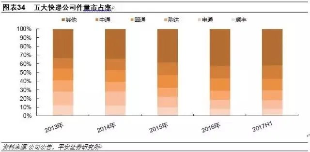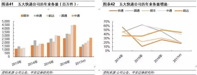 由此,我们认为国家邮政局披露数据或高于实际,统计口径扩大、转包重复计算、部分业务量虚报等因素导致高估。以快递公司报告数据为标准,五大快递公司16年合计业务增速42%,17年上半年合计业务增速30%,考虑五大快递公司58%的市场份额,则测算2017年以来行业增速下降约10%左右,优于官方呈现的20个百分点。