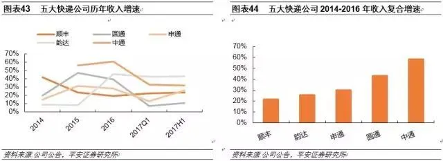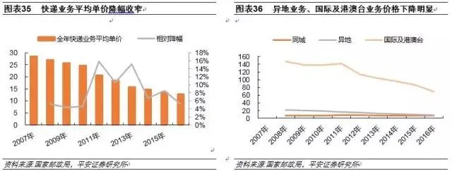 从前8月累计同比增速来看,2016年55%历年数据排名第二位,自电商发展进入快车道以来,快递业务增速随即站上50%高位,至2016年末,高增速已维持5年。目前,价格战趋于冷却,并购转型开启,大公司拥抱资本市场力求精细化发展,系列变动叠加数据呈现,我们认为行业已开始步入成长后期,未来基于较高增速的行业发展更趋理性,故此时的增速拐点更应解读为高基数带动的趋势性放缓,为行业发展阶段变动的正常体现。