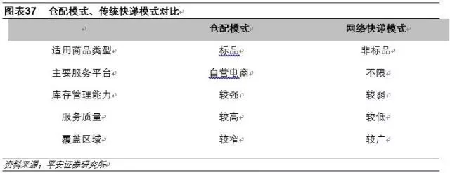 京东2016年11月推出“京东物流”全新品牌标识,正式宣布物流服务社会化。京东物流的特点是采用有别于传统网络快递模式的仓配模式,仓配模式先于交易、优先集结商品,注重仓储建设。以京东物流为代表的仓配模式主要服务于自营电商,基于其提前仓储属性,更适合配送标准商品,与三通一达、顺丰之类的网络快递相比,其库存管理能力更强、订单批量处理速度更快、服务质量更高,但也存在覆盖区域较窄、灵活性较差的问题。
