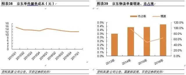 成本居高,行业冲击有限。基于仓储重要性,京东配送快递单件固定成本较高,且为支持媲美顺丰的高服务质量,人工等投入也相对较大,数据显示,京东单件履单成本平均在13元以上,据上文分析,三通一达单件快递成本6元左右、顺丰单件成本10-12元,总体而言,京东物流配送成本较高。业务量方面,京东物流单量年增速较高,基本维持60%以上,但就目前而言,市占率维持0.4%左右。故我们认为,京东物流社会化短期对行业现有格局冲击有限,中长期而言,基于电商格局的稳定性、受制于自身高成本,京东物流在电商市场的突破也相对较难。