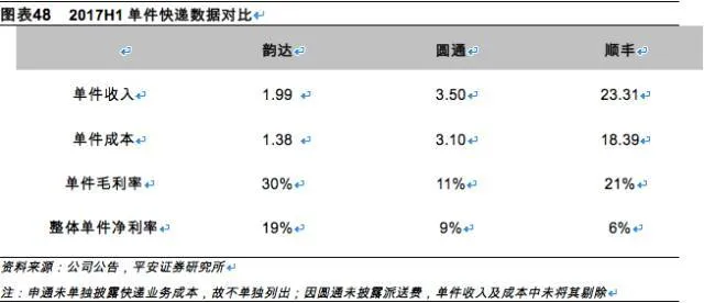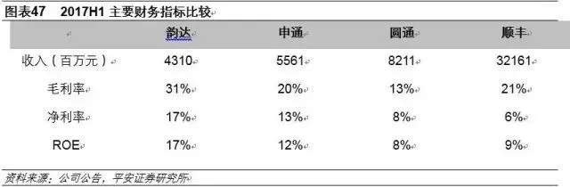 2017上半年具体情况,由于申通、圆通收入结构中含有代收的派送费,故毛利率、净利率相对韵达会较低,收入方面,顺丰受益于单票高收入而在总量上保持绝对优势,毛利率、净利率则低于三通一达,反应出直营模式重资产而带来的低利润率,ROE方面,韵达以17%领先行业,主要得益于较高的净利润率。