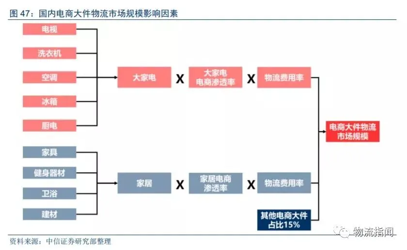 电商大件物流市场规模由家电、家居市场规模、对应的电商渗透率和物流费用率决定。随着最近几年大件商品电商渗透率迅速提升,线上B2C大件物流市场规模也在逐渐走高,下面我们就网购家电和网购家具两个细分市场进行分别讨论。