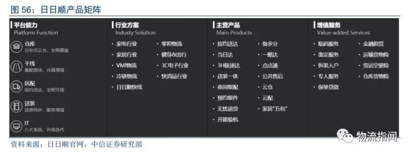 日日顺和上面三方物流企业不同,其背靠青岛海尔,在生产加工、销售服务过程中积累了很多仓储调配、库存管理、安装维修经验,因此日日顺不仅提供干支配送运输物流服务,还为B端客户提供仓储、库存管理等供应链服务,并为C端客户提供送装一体化服务。