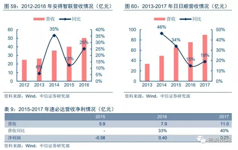 优速过去几年每年增速保持在50%以上;顺丰重货过去3年CAGR高达92%;德邦快递大件过去3年CAGR 高至141%;日日顺、安得、速必达等家电平台商自建物流过去几年增速也均维持在25%左右。