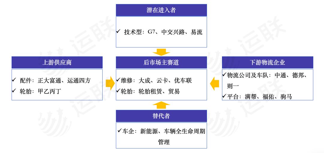 无论是上游的主机厂,还是下游的物流企业,都是巨头林立,而中间的后市场服务板块是一盘散沙。
