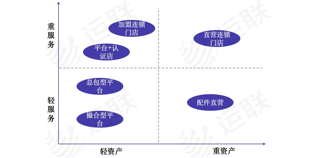 根据服务的轻重和资产的轻重,后市场可以分为「轻资产+轻服务」的撮合型和总包型平台、「轻资产+重服务」的加盟连锁和平台+认证店模式、「重资产+轻服务」的配件直营模式、「重资产+重服务」的直营连锁店模式。第四种模式在当前的情况下已经基本被排除在创业者的选择范围,投入资金和时间都太长。