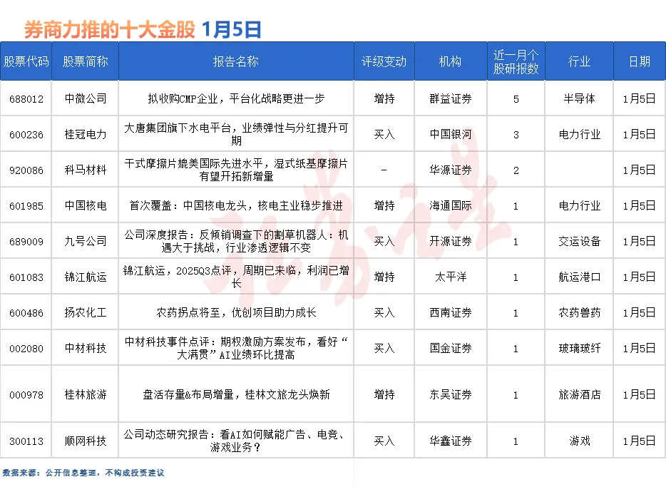 据证券之星数据库不完全统计,1月5日券商共给予超10家A股上市公司“买入”评级。从行业分布看,券商1月5日关注的个股聚焦于半导体、电力、交运设备、航运港口、农药兽药、玻璃玻纤、旅游酒店、游戏等行业。