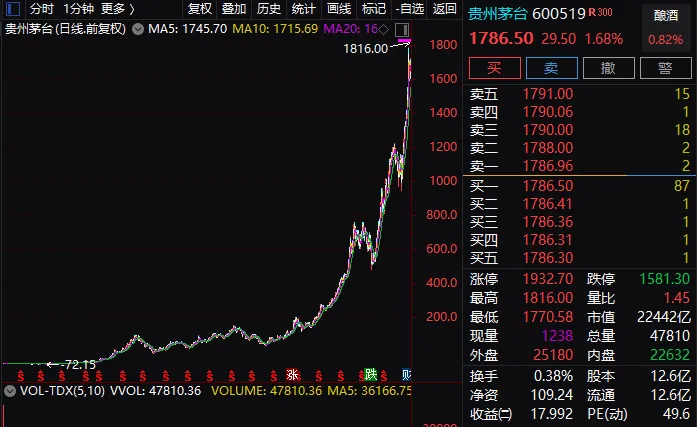 8月31日,A股再现跳水情形,三大股指均表现不佳,但消费股依然牛气冲天,涨幅居前,食品饮料板块整体上涨1.09%,居行业前列。其中,白酒消费股有突出表现,尤以贵州茅台为代表,股价一度拉升到1800元关口,再创历史新高,截至收盘,贵州茅台股价报1786.5元,总市值接近2.24万亿元。