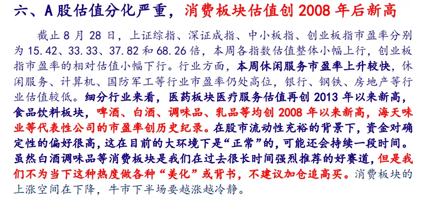 但是在消费股一片“炙手可热”之际,银河证券近期发布的一份策略研报却开始在市场上引发激烈反响。8月29日,银河证券发布策略周报《创业板注册制首周上涨,不为创纪录的消费股再唱赞歌》,对大多市场人士热捧的板块“泼冷水”,直言消费板块估值已创新高,意味着投资回报率下降。