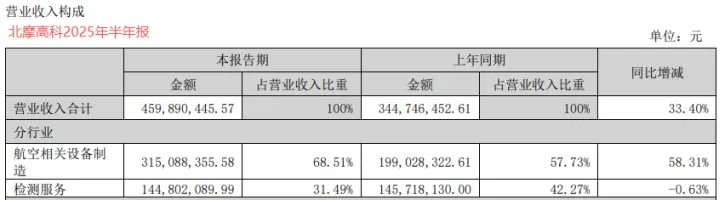 从营收结构看,公司目前构筑了两块核心业务,2025年半年报显示,航空设备制造营收占比高达68.51%,检测服务31.49%,看似两大业务,其实是公司构建起了从零部件到系统再到检测维修的全产业链服务能力。