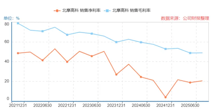 过去,北摩高科通过技术壁垒,收获了较高的产品溢价,公司毛利率常年维持在80%以上的超高水平,净利率更是在50%上下,盈利能力和茅台不相上下,可见其技术溢价的强悍水平。