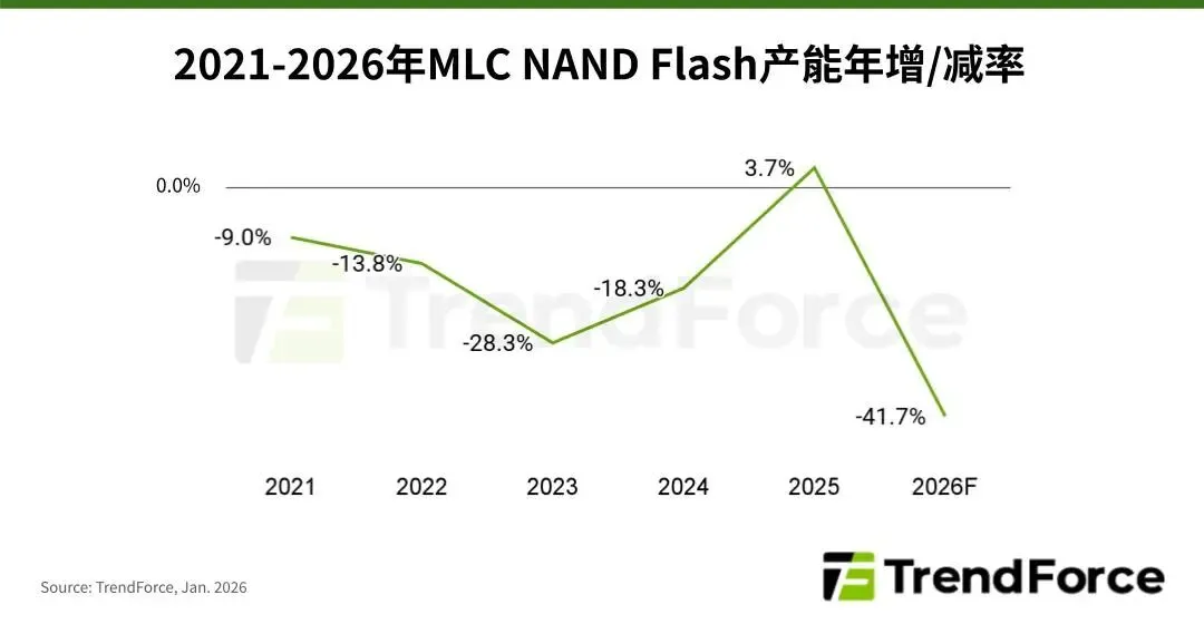 根据TrendForce集邦咨询最新研究,随着国际主要NAND Flash制造商退出或减少MLC NAND Flash生产,并集中资本支出与研发资源在先进制程,预估2026年全球MLC NAND Flash产能将年减41.7%,供需失衡情况加剧。