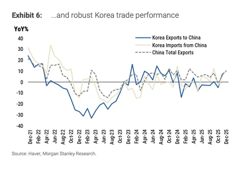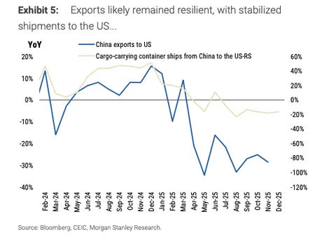 zf预算前置发力(2950亿元对比2025年第一季度的 2000亿元),地方zf更为积极,第一季度债券发行计划(已公布计划的 18个省份为6650亿元,对比去年同期的4220亿元),以及新的政策指导旨在提振年初资本支出。建设势头正在改善,水泥发货量显示反弹,表明2026年第一季度开局将更为稳固。前置的公共资本支出可能将2026年第一季度实际 GDP增速拉向5%的同比增长。地产市场持续疲软,零售势头在节日提振后正在减弱,服务消费低迷。北京已确认将继续支持消费品以旧换新,年度规模可能与去年类似,但初始分配额度较小。鉴于商品通缩和持续的住房市场疲软,核心CPI环比仍显乏力。 第四季度GDP增速仍维持在<4.5%,尽管年底可能出现反弹:12月的工业生产与资本支出增长可能从近期的放缓中反弹,支撑因素包括:- 外需依然具有韧性,这从对美出口企稳及韩国出口表现强劲中可见一斑