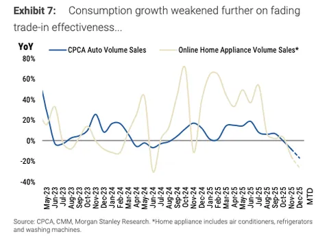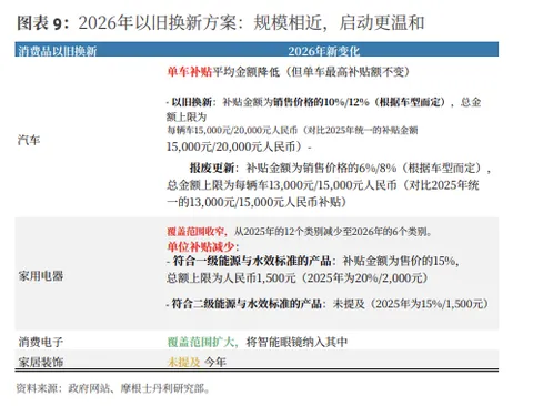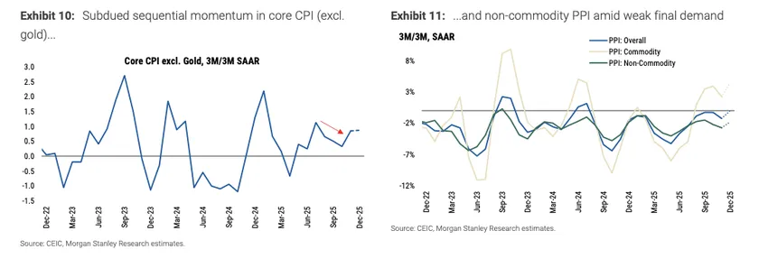 另一方面,消费增长可能进一步走弱,原因在于高基数效应、年底以旧换新政策支持力度减弱,以及持续房价下跌带来的负面财富效应加剧。 规模相近,启动更温和:北京于2025年12月30日发布了 详细指引——比去年提前一周——以确保政策连续性。我们预计年度补贴总额将 与去年相近(~3000亿元人民币)。尽管如此,在三月会议前提前拨付的额度较2025年有所减少(625亿元对比810亿元)——这可能反映了政策制定者试图平滑资金发放节奏——同时汽车和家电的单品补贴额度也被调低。在覆盖范围方面,新增了智能眼镜,而符合条件的家电品类则从12个减少至6个。鉴于持续的供需失衡以及仍以供给为核心的政策框架,大摩提醒不要将近期CPI和PPI的上升解读为持续再通胀的开始。分项数据显示,整体通胀读数的上升主要由黄金、煤炭和有色金属推动,而核心CPI(剔除黄金)和非商品PPI的环比动能因终端需求疲软而保持低迷。结合政策立场仍属渐进式、 反应式,这些因素强化了我们的观点,即2026年将是通缩减轻而非再通胀的一年。